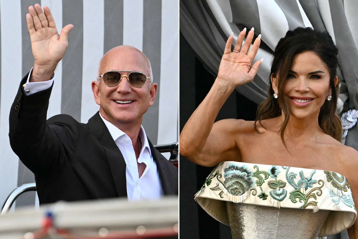 Bezos, 61, arrived in a sleek black suit and aviators, and aided his fiancée as she stepped into a water taxi. Sánchez dazzled in an off‑the‑shoulder golden Schiaparelli gown featuring a corseted waist and baroque-inspired floral embroidery.