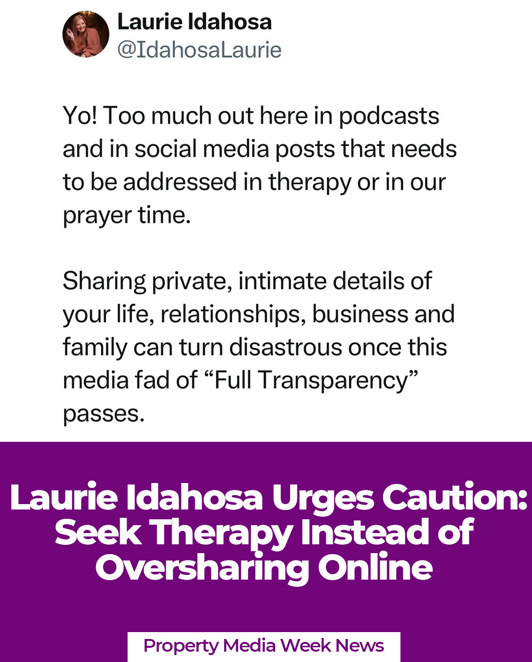 “Yo! Too much out here in podcasts and in social media posts that needs to be addressed in therapy or in our prayer time,” she wrote. “Sharing private, intimate details of your life, relationships, business and family can turn disastrous once this media fad of ‘Full Transparency’ passes.”